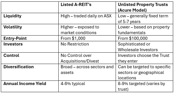- Consistent returns: Income from long-term leases, often at higher yields than listed A-REITs